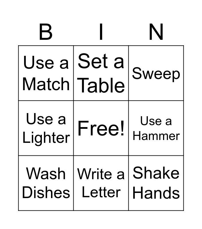 This bingo card has a free space and 9 words: Wash Dishes, Sweep, Set a Table, Use a Lighter, Use a Match, Use a Hammer, Shake Hands, Do 10 Jumping Jacks and Write a Letter.