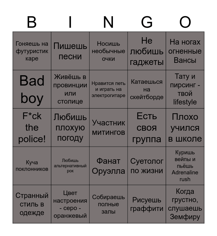 This bingo card has a free space and 24 words: Любишь альтернативный рок, Цвет настроения - серо - оранжевый, Нравится петь и играть на электрогитаре, Странный стиль в одежде, На ногах огненные Вансы, Гоняешь на футуристик каре, Bad boy, Пишешь песни, Есть своя группа, Фанат Оруэлла, Катаешься на скейтборде, F*ck the police!, Суетолог по жизни, Куришь вейпы и пьёшь Adrenaline rush, Живёшь в провинции или столице, Рисуешь граффити, Плохо учился в школе, Носишь необычные очки, Тату и пирсинг - твой lifestyle, Любишь плохую погоду, Когда грустно, слушаешь Земфиру, Куча поклонников, Не любишь гаджеты and Собираешь полные залы.