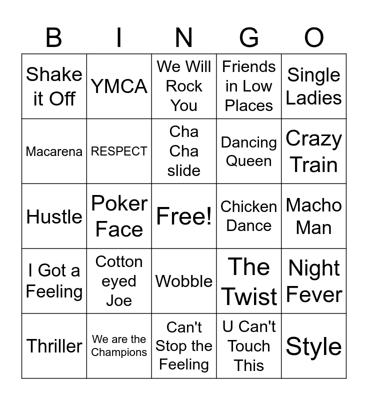This bingo card has a free space and 24 words: Cotton eyed Joe, We are the Champions, Cha Cha slide, Thriller, Single Ladies, Shake it Off, Macarena, YMCA, Chicken Dance, Wobble, Dancing Queen, Hustle, The Twist, Night Fever, RESPECT, U Can't Touch This, Macho Man, We Will Rock You, Crazy Train, Poker Face, Style, I Got a Feeling, Friends in Low Places and Can't Stop the Feeling.