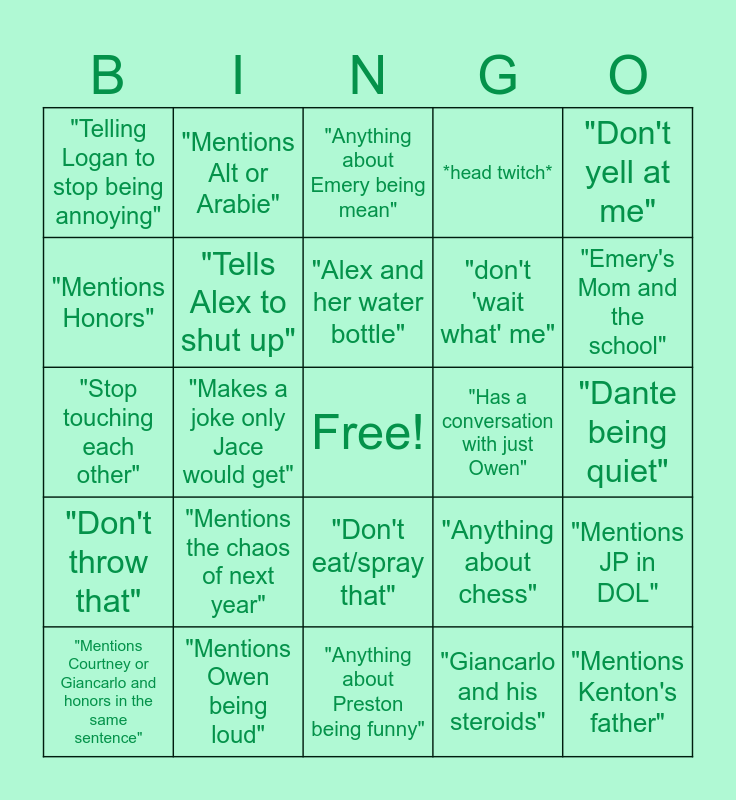 This bingo card has a free space and 27 words: "Anything about chess", "Gifted Representation", "don't 'wait what' me", "Anything about Preston being funny", "Mentions Honors", "Anything about Emery being mean", "Mentions Alt or Arabie", "Don't throw that", "Has a conversation with just Owen", "Mentions JP in DOL", "Stop touching each other", *head twitch*, "Mentions Courtney or Giancarlo and honors in the same sentence", "Mentions Owen being loud", "Emery's Mom and the school", "Bailee being normal or quiet", "Tells Alex to shut up", "Alex and her water bottle", "Mentions the chaos of next year", "Telling Logan to stop being annoying", "Dante being quiet", "Giancarlo and his steroids", "Makes a joke only Jace would get", "Mentions Kenton's father", "Don't eat/spray that", "Don't yell at me" and *head twitch*.