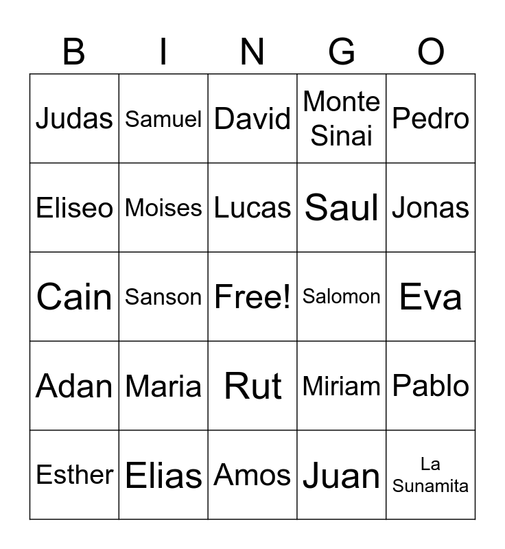 This bingo card has a free space and 24 words: Esther, Maria, Lucas, Juan, Pedro, Judas, Samuel, David, Salomon, Eva, Cain, Moises, Miriam, Pablo, Eliseo, Elias, Amos, Monte Sinai, Jonas, Adan, Sanson, Rut, Saul and La Sunamita.