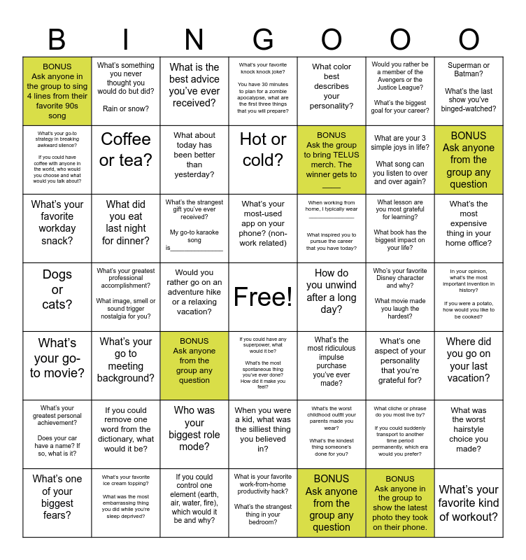 This bingo card has a free space and 48 words: What’s the worst childhood outfit your parents made you wear? What’s the kindest thing someone’s done for you?, What are your 3 simple joys in life? What song can you listen to over and over again?, What is your favorite work-from-home productivity hack? What’s the strangest thing in your bedroom?, What’s your greatest professional accomplishment? What image, smell or sound trigger nostalgia for you?, What’s the strangest gift you’ve ever received? My go-to karaoke song is_______________, In your opinion, what’s the most important invention in history? If you were a potato, how would you like to be cooked?, What’s something you never thought you would do but did? Rain or snow?, What’s your favorite ice cream topping? What was the most embarrassing thing you did while you’re sleep deprived?, Would you rather be a member of the Avengers or the Justice League? What’s the biggest goal for your career?, If you could have any superpower, what would it be? What’s the most spontaneous thing you’ve ever done? How did it make you feel?, Superman or Batman? What’s the last show you’ve binged-watched?, What’s your favorite knock knock joke? You have 30 minutes to plan for a zombie apocalypse, what are the first three things that you will prepare?, What lesson are you most grateful for learning? What book has the biggest impact on your life?, When working from home, I typically wear _______________ What inspired you to pursue the career that you have today?, What’s your greatest personal achievement? Does your car have a name? If so, what is it?, Who’s your favorite Disney character and why? What movie made you laugh the hardest?, What’s your go-to strategy in breaking awkward silence? If you could have coffee with anyone in the world, who would you choose and what would you talk about?, BONUS Ask anyone from the group any question, What cliche or phrase do you most live by? If you could suddenly transport to another time period permanently, which era would you prefer?, What color best describes your personality?, BONUS Ask the group to bring TELUS merch. The winner gets to ____, Would you rather go on an adventure hike or a relaxing vacation?, BONUS Ask anyone in the group to sing 4 lines from their favorite 90s song, Coffee or tea?, What was the worst hairstyle choice you made?, What about today has been better than yesterday?, What’s the most expensive thing in your home office?, What’s one of your biggest fears?, What’s your most-used app on your phone? (non-work related), What did you eat last night for dinner?, BONUS Ask anyone in the group to show the latest photo they took on their phone., How do you unwind after a long day?, Where did you go on your last vacation?, If you could remove one word from the dictionary, what would it be?, Dogs or cats?, What’s the most ridiculous impulse purchase you’ve ever made?, What’s one aspect of your personality that you’re grateful for?, What’s your favorite workday snack?, BONUS Ask anyone from the group any question, Who was your biggest role mode?, What’s your go-to movie?, What’s your favorite kind of workout?, What is the best advice you’ve ever received?, If you could control one element (earth, air, water, fire), which would it be and why?, Hot or cold?, When you were a kid, what was the silliest thing you believed in?, What’s your go to meeting background? and BONUS Ask anyone from the group any question.