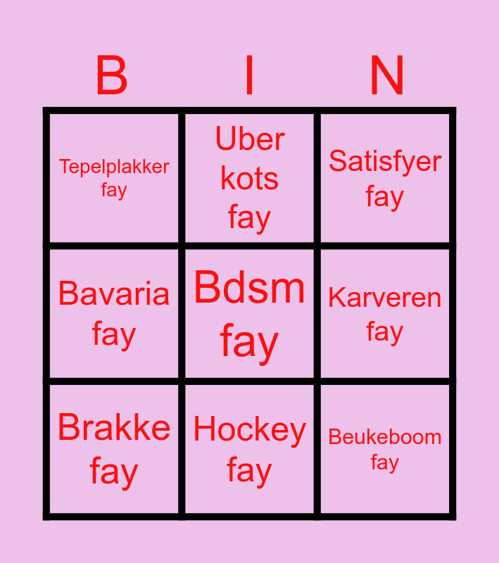 This bingo card has 20 words: Free!, Vet haar fay, Satisfyer fay, Kim jong Un fay, Vuur fay, Bdsm fay, Vinger fay, Tepelplakker fay, Beukeboom fay, Uber kots fay, Schmiechten fay, Schreeuw fay, Karveren fay, Knokke fay, Brakke fay, Drugs fay, Hockey fay, Bavaria fay, Bday fay and Fruit fay.