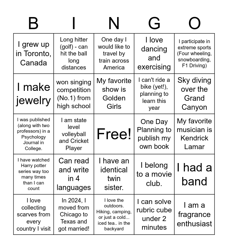 This bingo card has a free space and 24 words: Can read and write in 4 languages, In 2024, I moved from Chicago to Texas and got married!, My favorite show is Golden Girls, I love collecting scarves from every country I visit, I participate in extreme sports (Four wheeling, snowboarding, F1 Driving), I grew up in Toronto, Canada, I make jewelry, Long hitter (golf) - can hit the ball long distances, One Day Planning to publish my own book, I have an identical twin sister., I can't ride a bike (yet!), planning to learn this year, I was published (along with two professors) in a Psychology Journal in College., I belong to a movie club., I had a band, won singing competition (No.1) from high school, I can solve rubric cube under 2 minutes, My favorite musician is Kendrick Lamar, One day I would like to travel by train across America, Sky diving over the Grand Canyon, I am state level volleyball and Cricket Player, I am a fragrance enthusiast, I have watched Harry potter series way too many times than I can count, I love dancing and exercising and I love the outdoors. Hiking, camping, or just a cold... iced tea.. in the backyard.