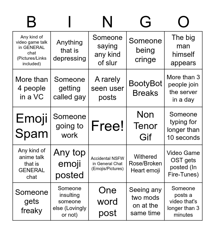 This bingo card has a free space and 24 words: Someone gets freaky, Any top emoji posted, A rarely seen user posts, Seeing any two mods on at the same time, The big man himself appears, Any kind of video game talk in GENERAL chat (Pictures/Links included), Anything that is depressing, Someone saying any kind of slur, Non Tenor Gif, Someone typing for longer than 10 seconds, Emoji Spam, Someone getting called gay, Withered Rose/Broken Heart emoji, Video Game OST gets posted (In Fire-Tunes), More than 4 people in a VC, Someone insulting someone else (Lovingly or not), One word post, Someone being cringe, More than 3 people join the server in a day, Any kind of anime talk that is GENERAL chat, Someone going to work, Accidental NSFW in General Chat (Emojis/Pictures), BootyBot Breaks and Someone posts a video that's longer than 3 minutes.