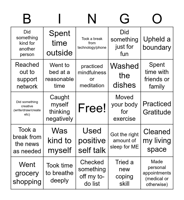 This bingo card has a free space and 24 words: Was kind to myself, Took time to breathe deeply, practiced mindfulness or meditation, Went grocery shopping, Upheld a boundary, Did something kind for another person, Reached out to support network, Spent time outside, Moved your body for exercise, Used positive self talk, Washed the dishes, Did something creative (write/draw/create etc), Got the right amount of sleep for ME, Cleaned my living space, Went to bed at a reasonable time, Tried a new coping skill, Practiced Gratitude, Took a break from technology/phone, Spent time with friends or family, Caught myself thinking negatively, Made personal appointments (medical or otherwise), Took a break from the news as needed, Did something just for fun and Checked something off my to-do list.