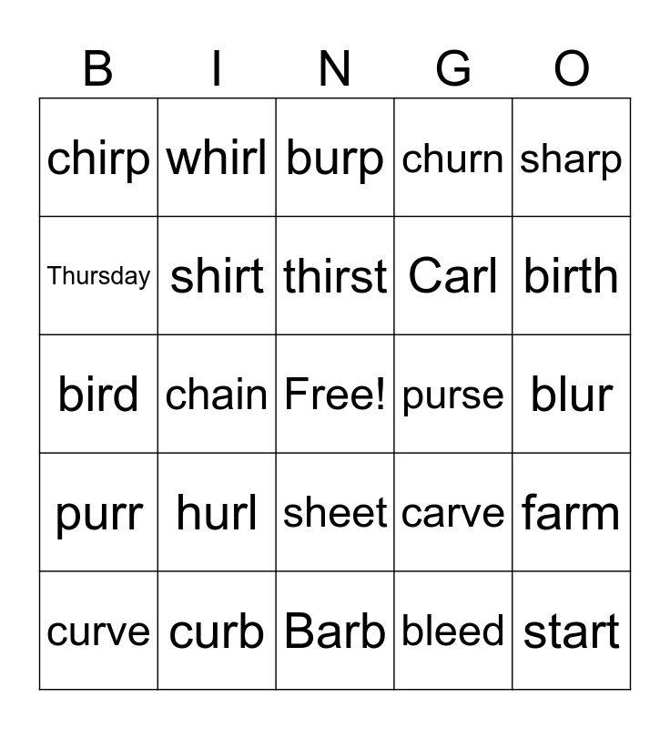 This bingo card has a free space and 41 words: sir, bird, bead, shirt, curb, sheet, thirst, skirt, sharp, purr, chain, churn, start, blur, purse, hurl, cheap, chirp, firm, burp, farm, curl, Barb, Carl, burst, blurt, bleed, nurse, birth, nerve, birch, whirl, curve, twirl, carve, Thursday, sharpen, northern, surrender, cheeseburger and birthday.