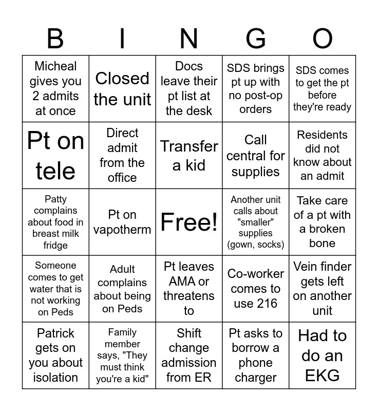 This bingo card has a free space and 24 words: Adult complains about being on Peds, Family member says, "They must think you're a kid", Transfer a kid, Patrick gets on you about isolation, SDS comes to get the pt before they're ready, Micheal gives you 2 admits at once, Pt on tele, Closed the unit, Another unit calls about "smaller" supplies (gown, socks), Pt leaves AMA or threatens to, Call central for supplies, Patty complains about food in breast milk fridge, Co-worker comes to use 216, Vein finder gets left on another unit, Direct admit from the office, Pt asks to borrow a phone charger, Take care of a pt with a broken bone, Docs leave their pt list at the desk, Residents did not know about an admit, Pt on vapotherm, Had to do an EKG, Someone comes to get water that is not working on Peds, SDS brings pt up with no post-op orders and Shift change admission from ER.