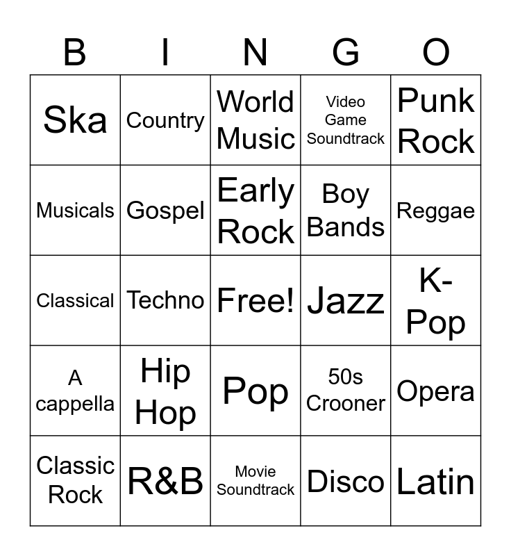 This bingo card has a free space and 24 words: Hip Hop, R&B, Early Rock, Classic Rock, Punk Rock, Ska, Musicals, Country, Jazz, Pop, Boy Bands, Classical, 50s Crooner, Opera, Gospel, Disco, K-Pop, World Music, Reggae, Techno, Latin, A cappella, Video Game Soundtrack and Movie Soundtrack.