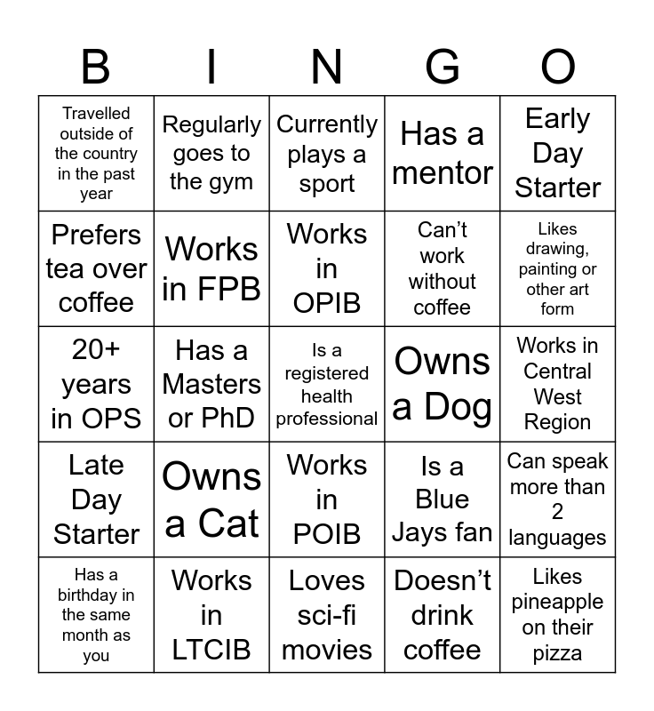 This bingo card has 40 words: 5-10 years in OPS, 20+ years in OPS, <1 year in OPS, Works in FPB, Works in LTCIB, Works in POIB, Works in OPIB, Works in ADMO, Early Day Starter, Late Day Starter, Has a Masters or PhD, Has a mentor, Is a registered health professional, Works in Central West Region, Owns a Dog, Owns a Cat, Owns a pet that is not a dog or a cat, Travelled outside of the country in the past year, Can play an instrument, Currently plays a sport, Can speak more than 2 languages, Doesn’t drink coffee, Can’t work without coffee, Prefers tea over coffee, Loves reading, Volunteers regularly, Born outside of Canada, Born in Ontario, Likes pineapple on their pizza, Hates pizza, Is wearing a red shirt, Has a birthday in the same month as you, Is a Leafs fan, Is a Blue Jays fan, Likes drawing, painting or other art form, Loves sci-fi movies, Loves rom-com movies, Loves nature, Regularly goes to the gym and Loves photography.