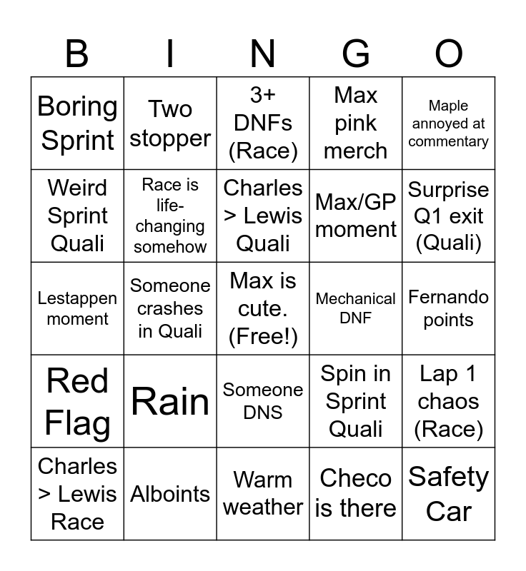 This bingo card has a free space and 24 words: Rain, Alboints, Charles > Lewis Quali, Charles > Lewis Race, Maple annoyed at commentary, Boring Sprint, Weird Sprint Quali, Two stopper, Mechanical DNF, Someone DNS, Max/GP moment, Lestappen moment, Spin in Sprint Quali, Lap 1 chaos (Race), Race is life-changing somehow, Checo is there, Fernando points, 3+ DNFs (Race), Surprise Q1 exit (Quali), Someone crashes in Quali, Safety Car, Red Flag, Max pink merch and Warm weather.