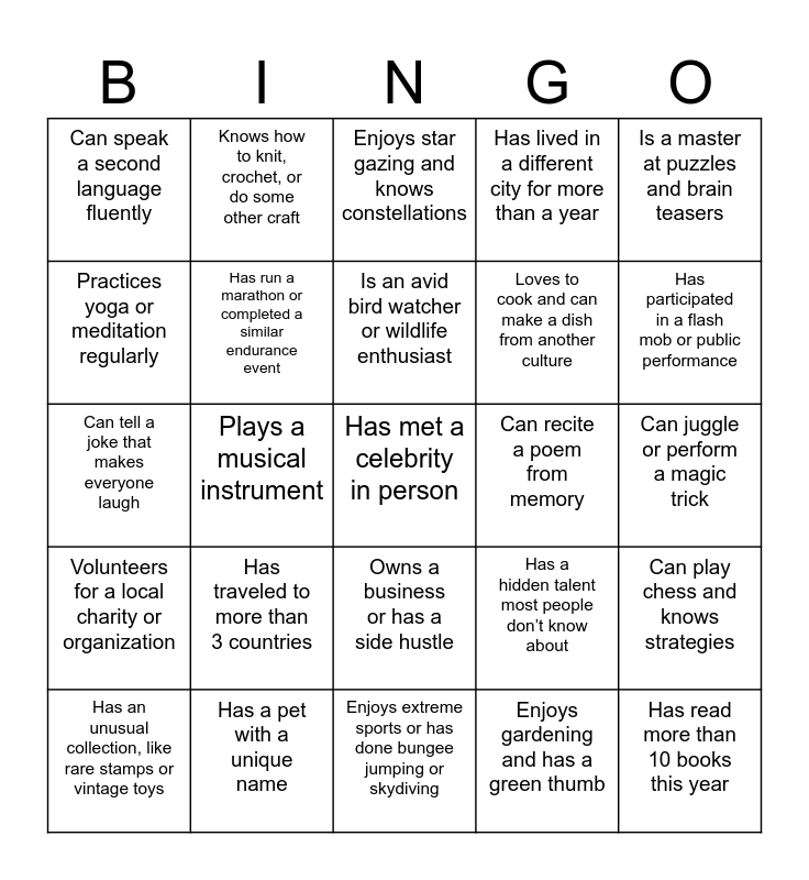 This bingo card has a free space and 24 words: Has traveled to more than 3 countries, Has a pet with a unique name, Is an avid bird watcher or wildlife enthusiast, Has an unusual collection, like rare stamps or vintage toys, Is a master at puzzles and brain teasers, Can speak a second language fluently, Practices yoga or meditation regularly, Knows how to knit, crochet, or do some other craft, Can recite a poem from memory, Owns a business or has a side hustle, Loves to cook and can make a dish from another culture, Can tell a joke that makes everyone laugh, Has a hidden talent most people don’t know about, Can play chess and knows strategies, Has run a marathon or completed a similar endurance event, Enjoys gardening and has a green thumb, Can juggle or perform a magic trick, Enjoys star gazing and knows constellations, Has participated in a flash mob or public performance, Plays a musical instrument, Has read more than 10 books this year, Volunteers for a local charity or organization, Has lived in a different city for more than a year and Enjoys extreme sports or has done bungee jumping or skydiving.