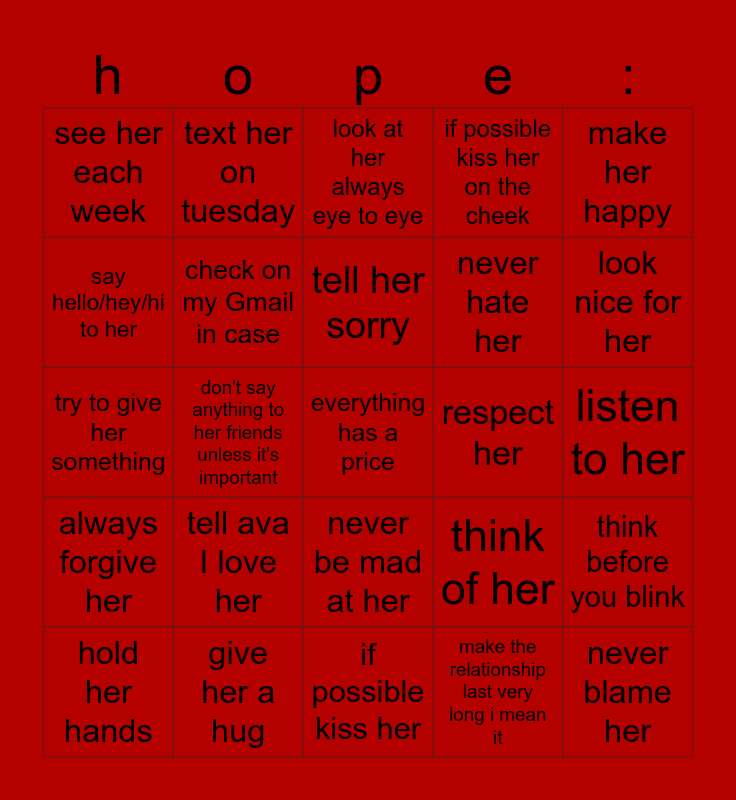 This bingo card has a free space and 24 words: tell ava I love her, give her a hug, tell her sorry, hold her hands, make her happy, see her each week, say hello/hey/hi to her, text her on tuesday, respect her, never be mad at her, never hate her, try to give her something, think of her, think before you blink, check on my Gmail in case, make the relationship last very long i mean it, listen to her, look at her always eye to eye, look nice for her, don't say anything to her friends unless it's important, never blame her, always forgive her, if possible kiss her on the cheek and if possible kiss her.