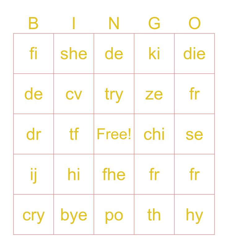 This bingo card has a free space and 24 words: hi, bye, try, cry, die, fi, de, she, chi, fhe, ze, dr, fr, fr, cv, th, se, de, fr, tf, hy, ij, ki and po.