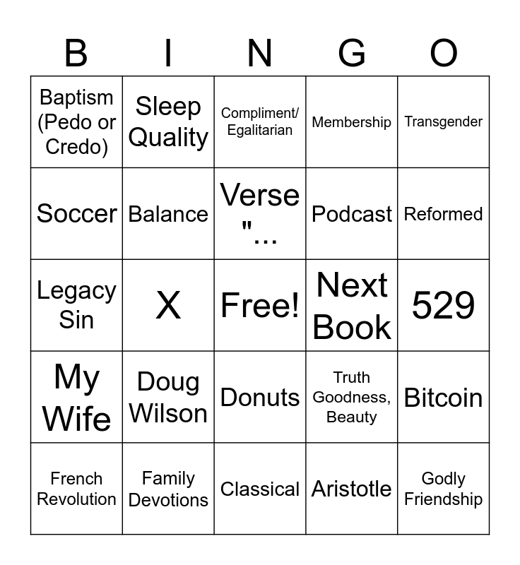 This bingo card has a free space and 24 words: Doug Wilson, Family Devotions, Verse "..., French Revolution, Transgender, Baptism (Pedo or Credo), Soccer, Sleep Quality, Next Book, Donuts, Podcast, Legacy Sin, Truth Goodness, Beauty, Bitcoin, Balance, Aristotle, 529, Compliment/ Egalitarian, Reformed, X, Godly Friendship, My Wife, Membership and Classical.