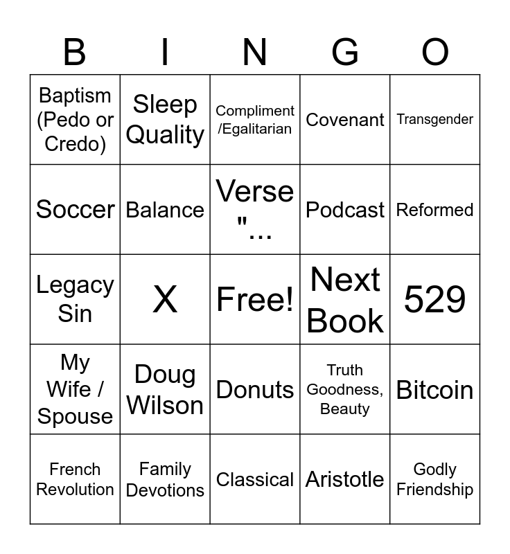 This bingo card has a free space and 24 words: Doug Wilson, Family Devotions, Verse "..., French Revolution, Transgender, Baptism (Pedo or Credo), Soccer, Sleep Quality, Next Book, Donuts, Podcast, Legacy Sin, Truth Goodness, Beauty, Bitcoin, Balance, Aristotle, 529, Compliment /Egalitarian, Reformed, X, Godly Friendship, My Wife / Spouse, Covenant and Classical.