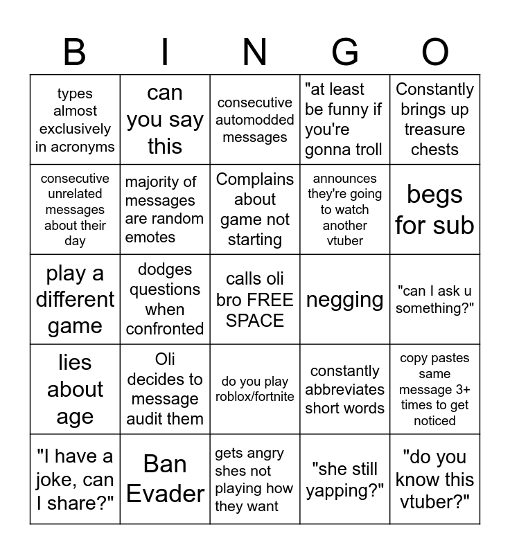 This bingo card has a free space and 24 words: Oli decides to message audit them, Ban Evader, Complains about game not starting, "I have a joke, can I share?", Constantly brings up treasure chests, types almost exclusively in acronyms, consecutive unrelated messages about their day, can you say this, negging, do you play roblox/fortnite, announces they're going to watch another vtuber, play a different game, constantly abbreviates short words, copy pastes same message 3+ times to get noticed, majority of messages are random emotes, "she still yapping?", "can I ask u something?", consecutive automodded messages, begs for sub, dodges questions when confronted, "do you know this vtuber?", lies about age, "at least be funny if you're gonna troll and gets angry shes not playing how they want.