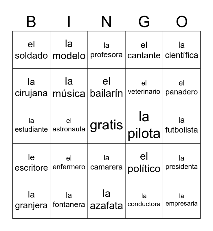 This bingo card has a free space and 49 words: el bombero, la empresaria, le periodista, la azafata, el enfermero, la abogada, la modelo, el médico, la cirujana, la ingeniera, la música, el cantante, la presidenta, el político, la fotógrafa, la agente inmobiliario, el bailarín, la pilota, la actríz, la científica, el astronauta, la conductora, el soldado, el veterinario, la carnicera, el panadero, la granjera, el cocinero, la camarera, le escritore, la peluquera, el barbero, la arquitecta, el carpintero, la fontanera, el mecánico, la pintora, el electricista, la futbolista, el árbitro, la recepcionista, el camarero de piso, el informático, el dependiente, la estudiante, la profesora, el director, el cartero and la repartidora.