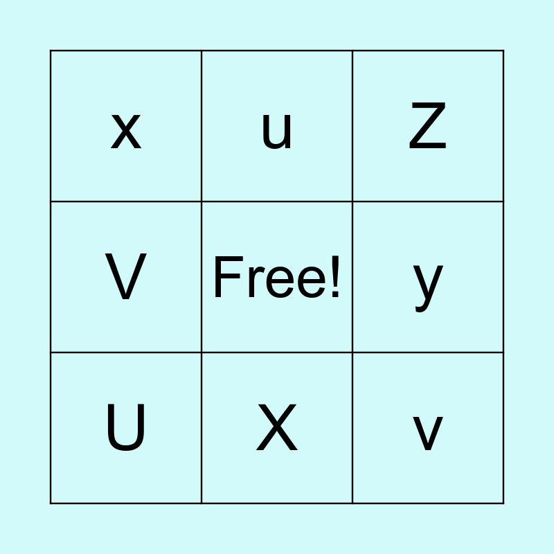 This bingo card has a free space and 14 words: T, t, U, u, V, v, W, w, X, x, Y, y, Z and z.