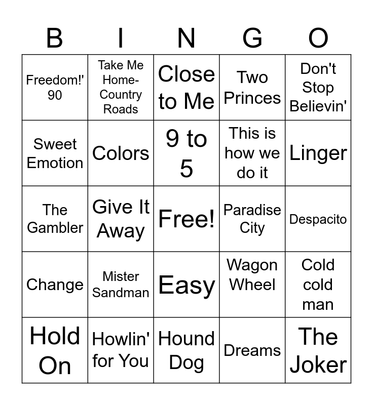 This bingo card has a free space and 24 words: Mister Sandman, Howlin' for You, 9 to 5, Hold On, Don't Stop Believin', Freedom!' 90, Sweet Emotion, Take Me Home- Country Roads, Paradise City, Easy, This is how we do it, The Gambler, Wagon Wheel, Cold cold man, Colors, Dreams, Despacito, Close to Me, Linger, Give It Away, The Joker, Change, Two Princes and Hound Dog.