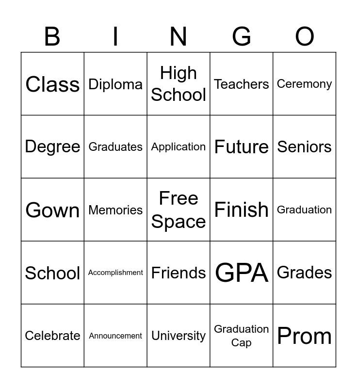 This bingo card has a free space and 24 words: Accomplishment, Announcement, Application, Celebrate, Ceremony, Class, Degree, Diploma, Finish, Friends, Future, Gown, GPA, Grades, Graduates, Graduation Cap, Graduation, High School, Seniors, Memories, Prom, School, Teachers and University.