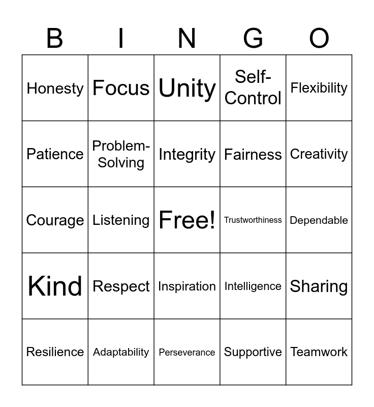 This bingo card has a free space and 24 words: Respect, Adaptability, Integrity, Resilience, Flexibility, Honesty, Patience, Focus, Trustworthiness, Inspiration, Fairness, Courage, Intelligence, Sharing, Problem-Solving, Supportive, Dependable, Unity, Creativity, Listening, Teamwork, Kind, Self-Control and Perseverance.