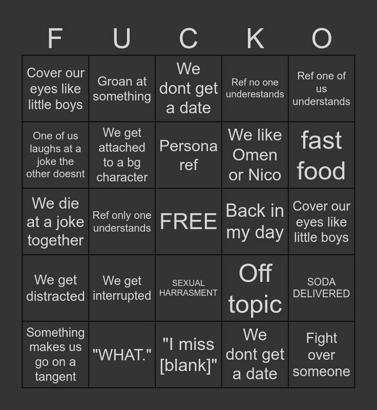 This bingo card has a free space and 24 words: We get interrupted, "WHAT.", Persona ref, Something makes us go on a tangent, Ref one of us understands, Cover our eyes like little boys, One of us laughs at a joke the other doesnt, Groan at something, Back in my day, SEXUAL HARRASMENT, We like Omen or Nico, We die at a joke together, Off topic, SODA DELIVERED, We get attached to a bg character, We dont get a date, Cover our eyes like little boys, We dont get a date, fast food, Ref only one understands, Fight over someone, We get distracted, Ref no one underestands and "I miss [blank]".