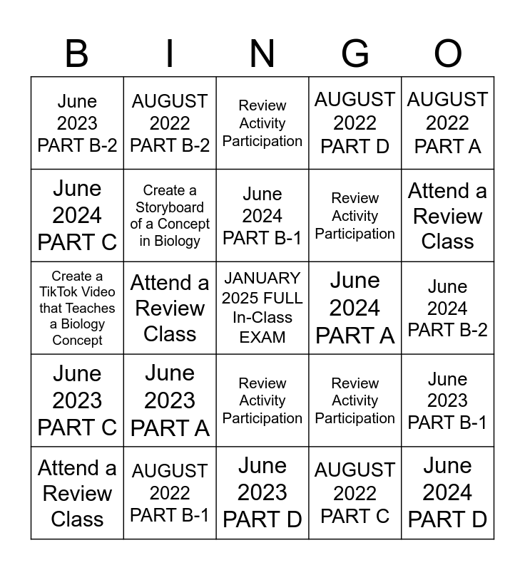 This bingo card has a free space and 24 words: June 2023 PART A, AUGUST 2022 PART B-1, June 2024 PART B-1, Attend a Review Class, AUGUST 2022 PART A, June 2023 PART B-2, June 2024 PART C, AUGUST 2022 PART B-2, June 2024 PART A, Review Activity Participation, Review Activity Participation, Create a TikTok Video that Teaches a Biology Concept, Review Activity Participation, June 2023 PART B-1, Create a Storyboard of a Concept in Biology, AUGUST 2022 PART C, June 2024 PART B-2, Review Activity Participation, Attend a Review Class, Attend a Review Class, June 2024 PART D, June 2023 PART C, AUGUST 2022 PART D and June 2023 PART D.