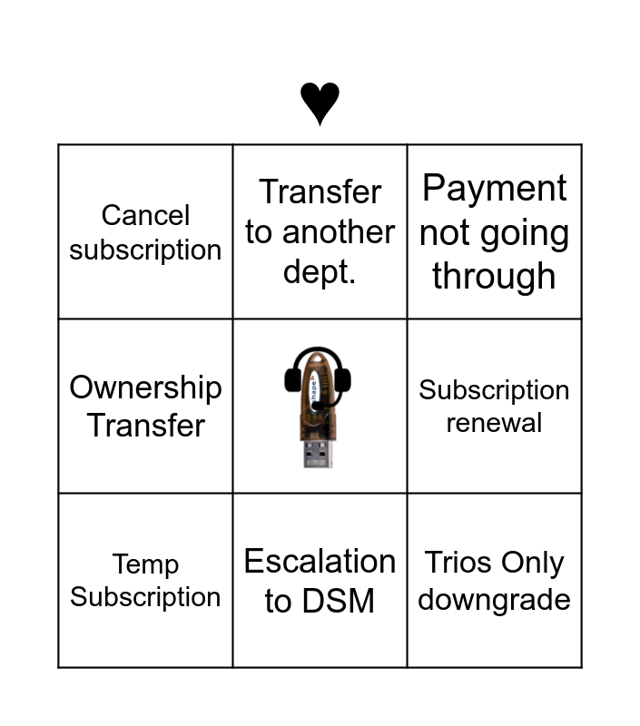 This bingo card has a free space and 11 words: 14 day ext, Escalation to DSM, Trios Only downgrade, Temp Subscription, Transfer to another dept., Payment not going through, Subscription renewal, DN Troubleshooting, Ownership Transfer, Cancel subscription and General questions.