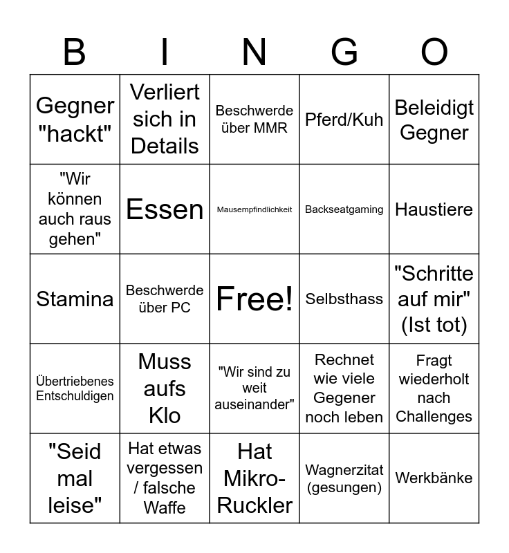 This bingo card has a free space and 25 words: Muss aufs Klo, Hat Mikro-Ruckler, Mausempfindlichkeit, "Seid mal leise", Beleidigt Gegner, Gegner "hackt", "Wir können auch raus gehen", Verliert sich in Details, Selbsthass, "Wir sind zu weit auseinander", Backseatgaming, Stamina, Rechnet wie viele Gegener noch leben, Fragt wiederholt nach Challenges, Essen, Muss Zimmer abdunkeln, "Schritte auf mir" (Ist tot), Beschwerde über MMR, Haustiere, Beschwerde über PC, Werkbänke, Hat etwas vergessen / falsche Waffe, Übertriebenes Entschuldigen, Pferd/Kuh and Wagnerzitat (gesungen).