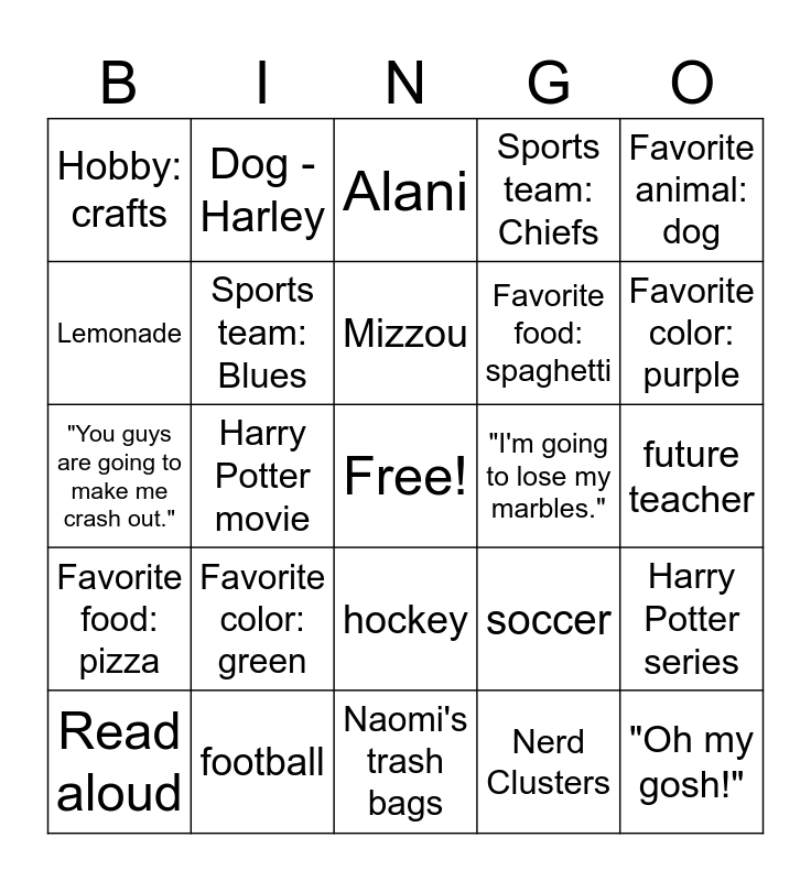 This bingo card has a free space and 24 words: Favorite color: green, football, Mizzou, Read aloud, Favorite animal: dog, Hobby: crafts, Lemonade, Dog - Harley, "I'm going to lose my marbles.", hockey, Favorite food: spaghetti, "You guys are going to make me crash out.", soccer, Harry Potter series, Sports team: Blues, Nerd Clusters, future teacher, Alani, Favorite color: purple, Harry Potter movie, "Oh my gosh!", Favorite food: pizza, Sports team: Chiefs and Naomi's trash bags.