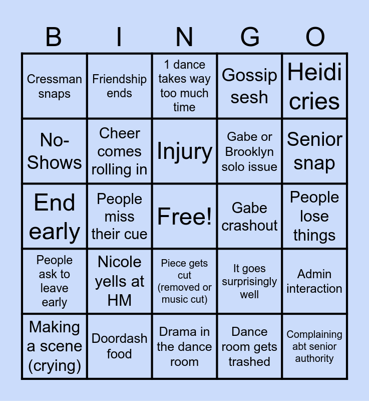 This bingo card has a free space and 24 words: Nicole yells at HM, Doordash food, Injury, Making a scene (crying), Heidi cries, Cressman snaps, No-Shows, Friendship ends, Gabe crashout, Piece gets cut (removed or music cut), Gabe or Brooklyn solo issue, End early, It goes surprisingly well, Admin interaction, Cheer comes rolling in, Dance room gets trashed, People lose things, 1 dance takes way too much time, Senior snap, People miss their cue, Complaining abt senior authority, People ask to leave early, Gossip sesh and Drama in the dance room.