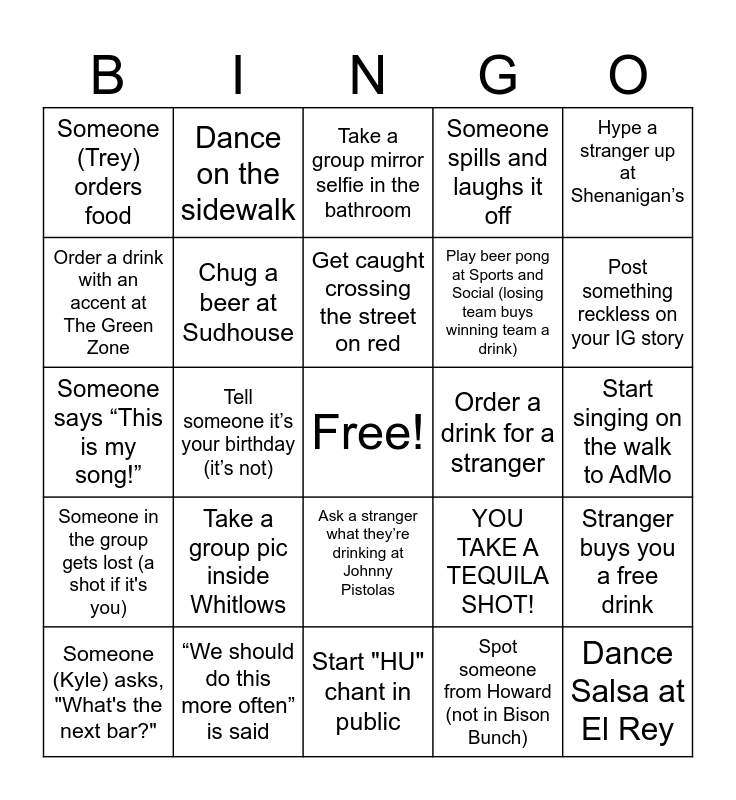 This bingo card has a free space and 24 words: Take a group pic inside Whitlows, “We should do this more often” is said, Get caught crossing the street on red, Someone (Kyle) asks, "What's the next bar?", Hype a stranger up at Shenanigan’s, Someone (Trey) orders food, Order a drink with an accent at The Green Zone, Dance on the sidewalk, Order a drink for a stranger, Ask a stranger what they’re drinking at Johnny Pistolas, Play beer pong at Sports and Social (losing team buys winning team a drink), Someone says “This is my song!”, YOU TAKE A TEQUILA SHOT!, Stranger buys you a free drink, Chug a beer at Sudhouse, Spot someone from Howard (not in Bison Bunch), Start singing on the walk to AdMo, Take a group mirror selfie in the bathroom, Post something reckless on your IG story, Tell someone it’s your birthday (it’s not), Dance Salsa at El Rey, Someone in the group gets lost (a shot if it's you), Someone spills and laughs it off and Start "HU" chant in public.
