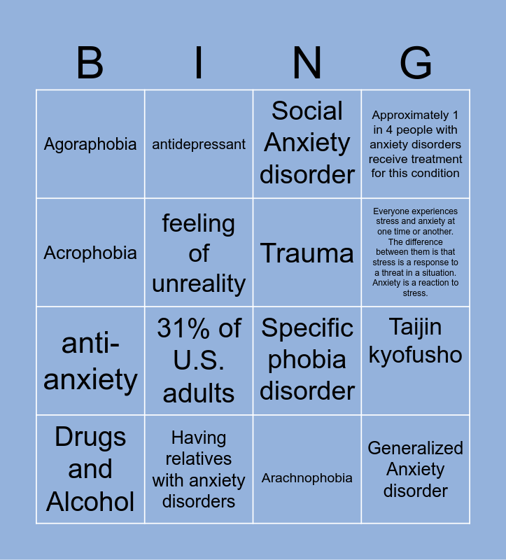 This bingo card has 19 words: Specific phobia disorder, Panic disorder, Social Anxiety disorder, Generalized Anxiety disorder, Taijin kyofusho, Acrophobia, Arachnophobia, Agoraphobia, antidepressant, anti-anxiety, 31% of U.S. adults, feeling of unreality, Trauma, Having relatives with anxiety disorders, Drugs and Alcohol, More women are affect by anxiety than men, Approximately 1 in 4 people with anxiety disorders receive treatment for this condition, Everyone experiences stress and anxiety at one time or another. The difference between them is that stress is a response to a threat in a situation. Anxiety is a reaction to stress. and Many people with an anxiety disorder also have a co-occurring disorder or physical illness, which can make their symptoms worse and recovery more difficult..