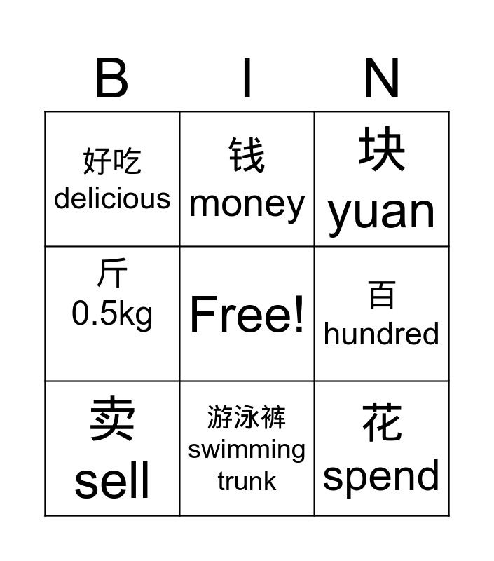 This bingo card has a free space and 9 words: 卖 sell, 块 yuan, 钱 money, 斤 0.5kg, 好吃 delicious, 百 hundred, 花 spend, 游泳衣 swimsuit and 游泳裤 swimming trunk.