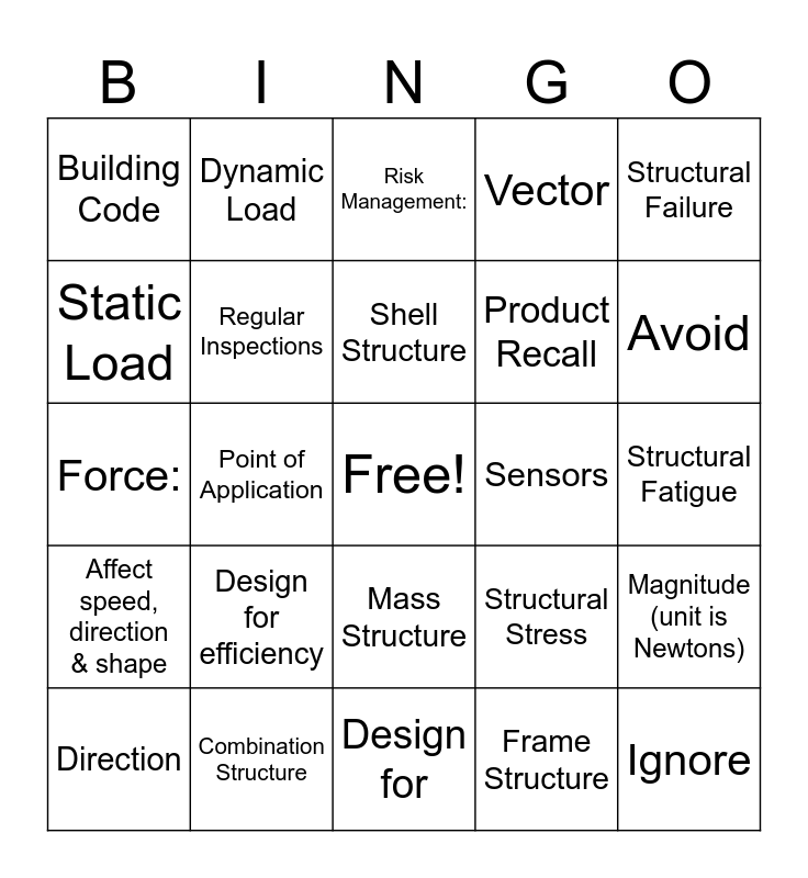 This bingo card has a free space and 26 words: Mass Structure, Frame Structure, Shell Structure, Combination Structure, Structural Failure, Building Code, Static Load, Dynamic Load, Structural Fatigue, Structural Stress, Product Recall, Force:, Magnitude (unit is Newtons), Direction, Point of Application, Plane of Application, Vector, Affect speed, direction & shape, Risk Management:, Ignore, Avoid, Design for, Sensors, Design for efficiency, Regular Inspections and Symmetry in Structures.