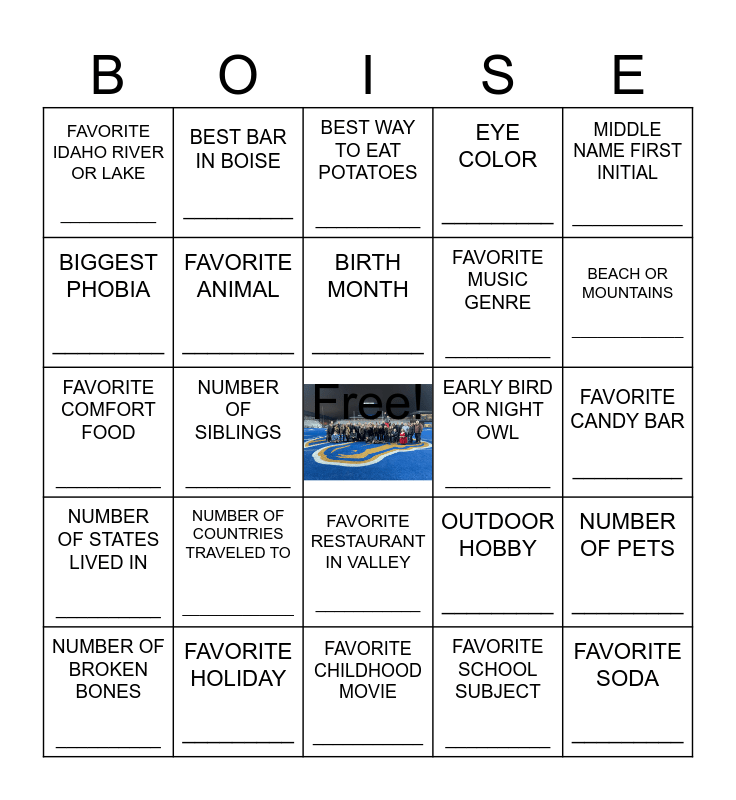 This bingo card has a free space and 24 words: NUMBER OF BROKEN BONES __________, NUMBER OF COUNTRIES TRAVELED TO _____________, BIRTH MONTH _________, FAVORITE SCHOOL SUBJECT __________, MIDDLE NAME FIRST INITIAL ___________, FAVORITE IDAHO RIVER OR LAKE __________, BEST BAR IN BOISE __________, BEST WAY TO EAT POTATOES __________, EARLY BIRD OR NIGHT OWL __________, FAVORITE CANDY BAR __________, FAVORITE COMFORT FOOD __________, FAVORITE ANIMAL _________, OUTDOOR HOBBY _________, NUMBER OF PETS _________, BIGGEST PHOBIA _________, FAVORITE HOLIDAY _________, FAVORITE CHILDHOOD MOVIE ___________, EYE COLOR _________, BEACH OR MOUNTAINS _____________, NUMBER OF STATES LIVED IN __________, NUMBER OF SIBLINGS __________, FAVORITE RESTAURANT IN VALLEY ___________, FAVORITE MUSIC GENRE __________ and FAVORITE SODA _________.
