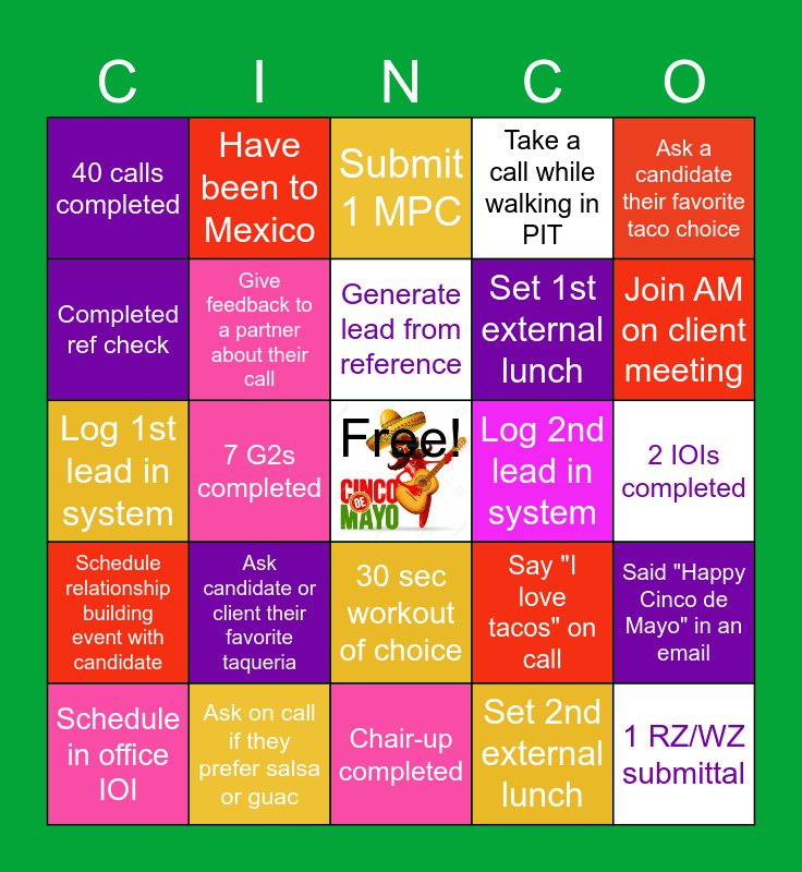 This bingo card has a free space and 24 words: Schedule in office IOI, Ask candidate or client their favorite taqueria, Generate lead from reference, Set 2nd external lunch, Ask a candidate their favorite taco choice, 40 calls completed, Have been to Mexico, Submit 1 MPC, Log 2nd lead in system, 2 IOIs completed, Log 1st lead in system, Give feedback to a partner about their call, Say "I love tacos" on call, Said "Happy Cinco de Mayo" in an email, Completed ref check, Ask on call if they prefer salsa or guac, Chair-up completed, Take a call while walking in PIT, Join AM on client meeting, Schedule relationship building event with candidate, 7 G2s completed, 30 sec workout of choice, Set 1st external lunch and 1 RZ/WZ submittal.