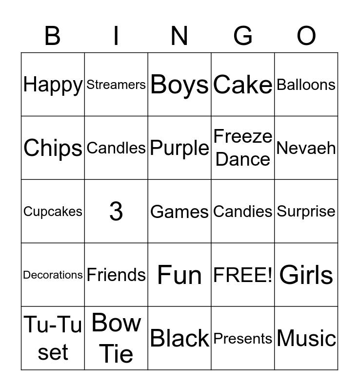 This bingo card has 25 words: Friends, Black, Purple, Tu-Tu set, Balloons, Happy, Chips, Streamers, Candies, Fun, Freeze Dance, Cupcakes, FREE!, Girls, Candles, Music, Surprise, Boys, Nevaeh, 3, Games, Bow Tie, Decorations, Cake and Presents.