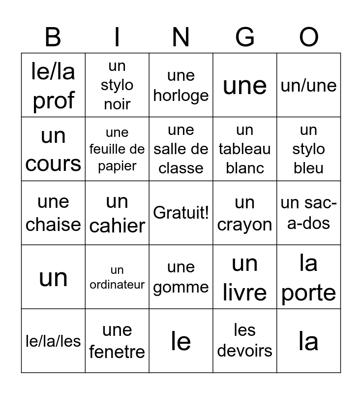 This bingo card has a free space and 24 words: un ordinateur, une fenetre, une salle de classe, le/la/les, un/une, le/la prof, un cours, un stylo noir, un crayon, une gomme, un tableau blanc, une chaise, un livre, la porte, une feuille de papier, les devoirs, un sac-a-dos, une horloge, un stylo bleu, un cahier, la, un, une and le.