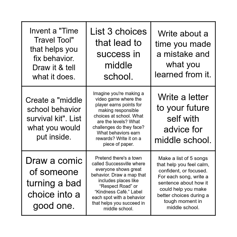 This bingo card has 9 words: Draw a comic of someone turning a bad choice into a good one., Write about a time you made a mistake and what you learned from it., List 3 choices that lead to success in middle school., Create a "middle school behavior survival kit". List what you would put inside., Invent a "Time Travel Tool" that helps you fix behavior. Draw it & tell what it does., Write a letter to your future self with advice for middle school., Imagine you're making a video game where the player earns points for making responsible choices at school. What are the levels? What challenges do they face? What behaviors earn rewards? Write it on a piece of paper., Make a list of 5 songs that help you feel calm, confident, or focused. For each song, write a sentence about how it could help you make better choices during a tough moment in middle school. and Pretend there's a town called Successville where everyone shows great behavior. Draw a map that includes places like “Respect Road” or “Kindness Café.” Label each spot with a behavior that helps you succeed in middle school..