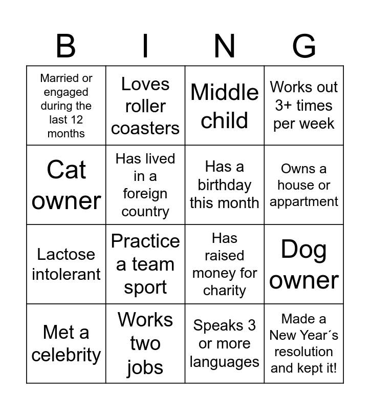 This bingo card has 16 words: Works two jobs, Dog owner, Middle child, Married or engaged during the last 12 months, Lactose intolerant, Loves roller coasters, Has raised money for charity, Speaks 3 or more languages, Cat owner, Has lived in a foreign country, Met a celebrity, Works out 3+ times per week, Practice a team sport, Owns a house or appartment, Has a birthday this month and Made a New Year´s resolution and kept it!.