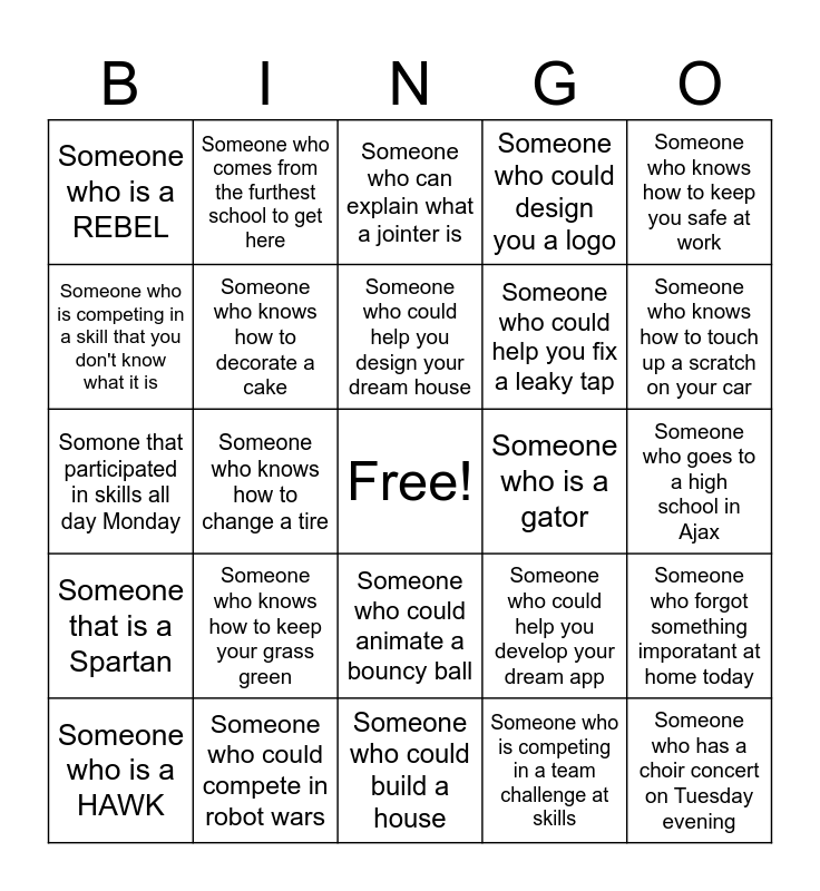 This bingo card has a free space and 29 words: Someone who is a HAWK, SOMEONE WHO WENT TO THE SAME SCHOOL AS BOY-1da, Someone who knows how to change a tire, Someone who knows what the Urban Pantry is, Someone who is a REBEL, Someone who can explain what a jointer is, Someone who knows how to decorate a cake, Someone who knows how to keep your grass green, Someone who is a gator, Someone who could compete in robot wars, Someone who goes to a high school in Ajax, Someone who has a choir concert on Tuesday evening, Someone who could build a house, Someone who is competing in a team challenge at skills, Someone who knows how to touch up a scratch on your car, Someone who could take a great picture, Someone who could animate a bouncy ball, Someone that is a Spartan, Someone who knows how to keep you safe at work, Somone that participated in skills all day Monday, Someone who could help you develop your dream app, Someone who is enrolled in a SHSM, Someone who could help you fix a leaky tap, Someone who is competing in a skill that you don't know what it is, Someone who could design you a logo, Someone who comes from the furthest school to get here, Someone who forgot something imporatant at home today, Someone who could help you design your dream house and Someone who is excited to be here and take part in skills.