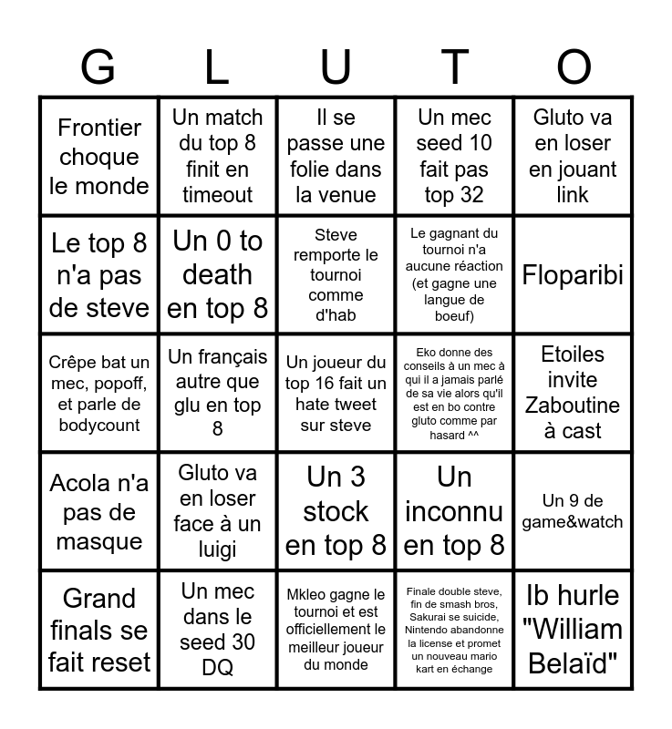 This bingo card has 25 words: Gluto va en loser face à un luigi, Mkleo gagne le tournoi et est officiellement le meilleur joueur du monde, Steve remporte le tournoi comme d'hab, Grand finals se fait reset, Gluto va en loser en jouant link, Frontier choque le monde, Le top 8 n'a pas de steve, Un match du top 8 finit en timeout, Eko donne des conseils à un mec à qui il a jamais parlé de sa vie alors qu'il est en bo contre gluto comme par hasard ^^, Un 3 stock en top 8, Le gagnant du tournoi n'a aucune réaction (et gagne une langue de boeuf), Crêpe bat un mec, popoff, et parle de bodycount, Un inconnu en top 8, Un 9 de game&watch, Un 0 to death en top 8, Ib hurle "William Belaïd", Etoiles invite Zaboutine à cast, Il se passe une folie dans la venue, Floparibi, Un français autre que glu en top 8, Un joueur du top 16 fait un hate tweet sur steve, Un mec dans le seed 30 DQ, Acola n'a pas de masque, Un mec seed 10 fait pas top 32 and Finale double steve, fin de smash bros, Sakurai se suicide, Nintendo abandonne la license et promet un nouveau mario kart en échange.