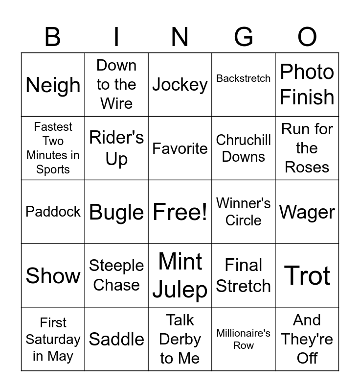 This bingo card has a free space and 34 words: Big Hat, Millionaire's Row, Win, Place, Show, Rider's Up, Photo Finish, First Saturday in May, Down to the Wire, My Old Kentucky Home, Favorite, Jockey, Horseshoe, Blue Grass, Winner's Circle, Run for the Roses, Saddle, Paddock, Steeple Chase, Final Stretch, Mint Julep, Triple Crown, Neigh, Wager, Talk Derby to Me, And They're Off, Backstretch, Place Your Bets, Chruchill Downs, Fastest Two Minutes in Sports, Wager, Bugle, Trot and Leads by a Length.