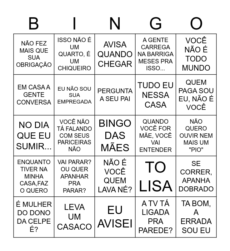 This bingo card has a free space and 29 words: NA VOLTA A GENTE COMPRA, LEVA UM CASACO, AVISA QUANDO CHEGAR, SE EU FOR AÍ, E ACHAR, ESFREGO NA SUA CARA, VOCÊ NÃO É TODO MUNDO, NÃO FEZ MAIS QUE SUA OBRIGAÇÃO, EU NÃO SOU SUA EMPREGADA, PERGUNTA A SEU PAI, QUANDO VOCÊ FOR MÃE, VOCÊ VAI ENTENDER, SE CORRER, APANHA DOBRADO, É MULHER DO DONO DA CELPE É?, VOCÊ NÃO TÁ FALANDO COM SEUS PARICEIRAS NÃO, A TV TÁ LIGADA PRA PAREDE?, TA BOM, A ERRADA SOU EU, NO DIA QUE EU SUMIR..., NÃO TEM MAIS NEM MENOS, EU AVISEI, TO LISA, QUEM PAGA SOU EU, NÃO É VOCÊ, ENQUANTO TIVER NA MINHA CASA,FAZ O QUERO, VAI PARAR? OU QUER APANHAR PRA PARAR?, ENGULA O CHORO, SE NÃO VOU DAR MOTIVO PRA CHORAR DE VERDADE, TUDO EU NESSA CASA, NÃO QUERO OUVIR NEM MAIS UM "PIO", EM CASA A GENTE CONVERSA, ISSO NÃO É UM QUARTO, É UM CHIQUEIRO, NÃO É VOCÊ QUEM LAVA NÉ?, A GENTE CARREGA NA BARRIGA MESES PRA ISSO... and NÃO ESTOU PEDINDO, ESTOU MANDANDO.
