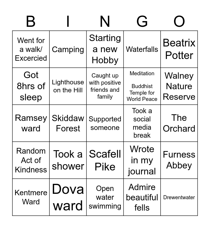 This bingo card has a free space and 24 words: Took a shower, Dova ward, Caught up with positive friends and family, Kentmere Ward, Beatrix Potter, Went for a walk/ Excercied, Got 8hrs of sleep, Camping, Took a social media break, Scafell Pike, Meditation Buddhist Temple for World Peace, Ramsey ward, Wrote in my journal, Furness Abbey, Lighthouse on the Hill, Admire beautiful fells, The Orchard, Starting a new Hobby, Walney Nature Reserve, Skiddaw Forest, Drewentwater, Random Act of Kindness, Waterfalls and Open water swimming.