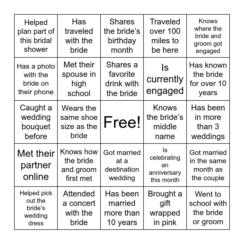 This bingo card has a free space and 24 words: Knows how the bride and groom first met, Attended a concert with the bride, Shares a favorite drink with the bride, Helped pick out the bride’s wedding dress, Knows where the bride and groom got engaged, Helped plan part of this bridal shower, Has a photo with the bride on their phone, Has traveled with the bride, Knows the bride’s middle name, Got married at a destination wedding, Is currently engaged, Caught a wedding bouquet before, Is celebrating an anniversary this month, Got married in the same month as the couple, Met their spouse in high school, Brought a gift wrapped in pink, Has been in more than 3 weddings, Shares the bride’s birthday month, Has known the bride for over 10 years, Wears the same shoe size as the bride, Went to school with the bride or groom, Met their partner online, Traveled over 100 miles to be here and Has been married more than 10 years.