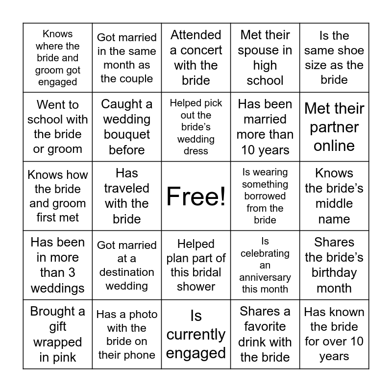 This bingo card has a free space and 24 words: Got married at a destination wedding, Has a photo with the bride on their phone, Helped pick out the bride’s wedding dress, Brought a gift wrapped in pink, Is the same shoe size as the bride, Knows where the bride and groom got engaged, Went to school with the bride or groom, Got married in the same month as the couple, Is wearing something borrowed from the bride, Helped plan part of this bridal shower, Has been married more than 10 years, Knows how the bride and groom first met, Is celebrating an anniversary this month, Shares the bride’s birthday month, Caught a wedding bouquet before, Shares a favorite drink with the bride, Knows the bride’s middle name, Attended a concert with the bride, Met their partner online, Has traveled with the bride, Has known the bride for over 10 years, Has been in more than 3 weddings, Met their spouse in high school and Is currently engaged.