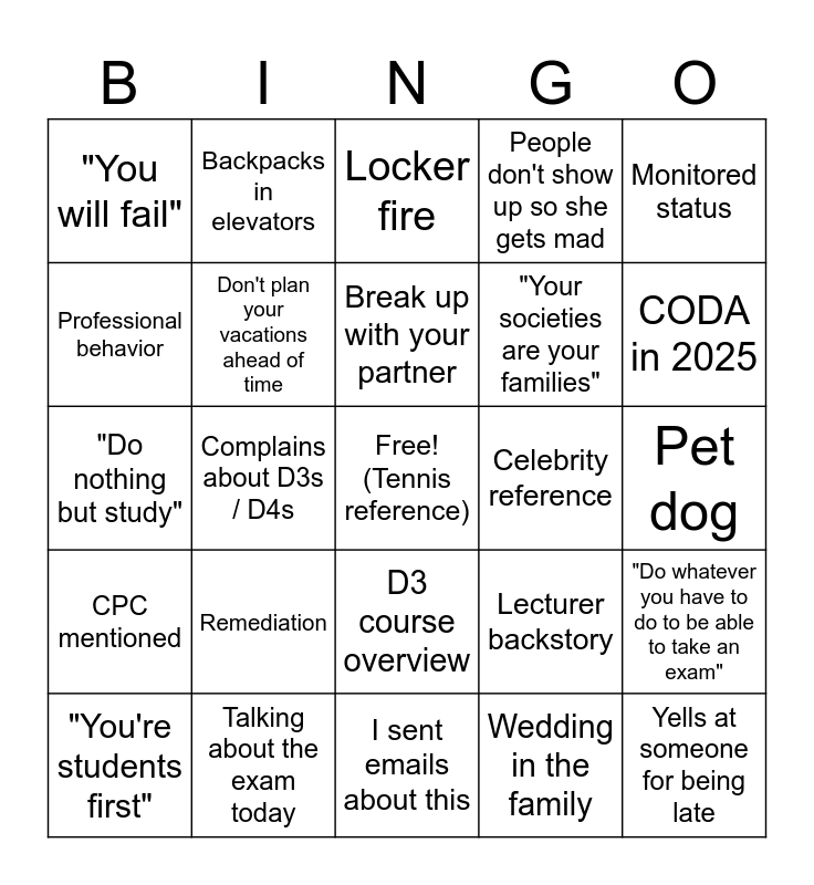 This bingo card has a free space and 24 words: Remediation, Talking about the exam today, Break up with your partner, "You're students first", Monitored status, "You will fail", Professional behavior, Backpacks in elevators, Celebrity reference, D3 course overview, "Your societies are your families", "Do nothing but study", Lecturer backstory, "Do whatever you have to do to be able to take an exam", Don't plan your vacations ahead of time, Wedding in the family, Pet dog, Locker fire, CODA in 2025, Complains about D3s / D4s, Yells at someone for being late, CPC mentioned, People don't show up so she gets mad and I sent emails about this.